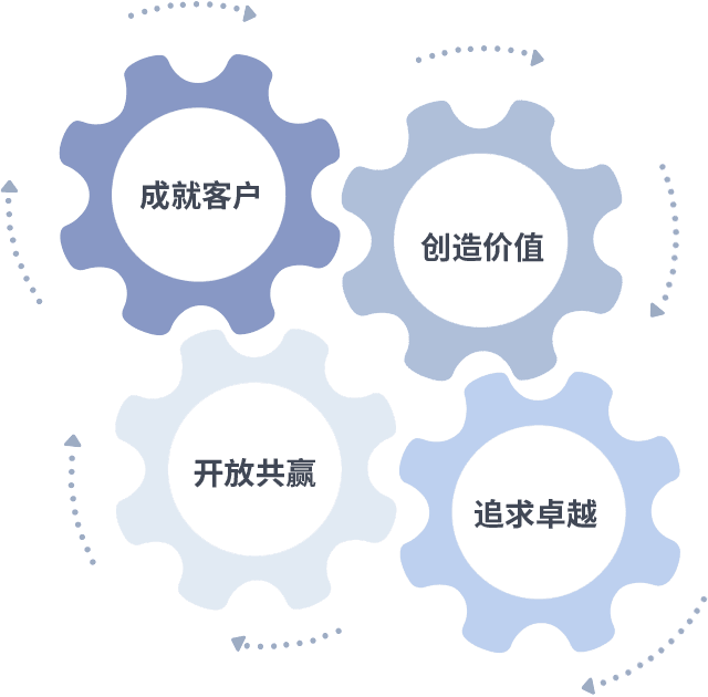 成就客户是一切决策的出发点,,创造价值是衡量所有工作的标准,,,追求卓越是我们做事做人的态度,,,,开放共赢是我们的格局也是最终的结果。。价值观的齿轮环环相扣,,,推动着组织里的每个人不断向前。。。。