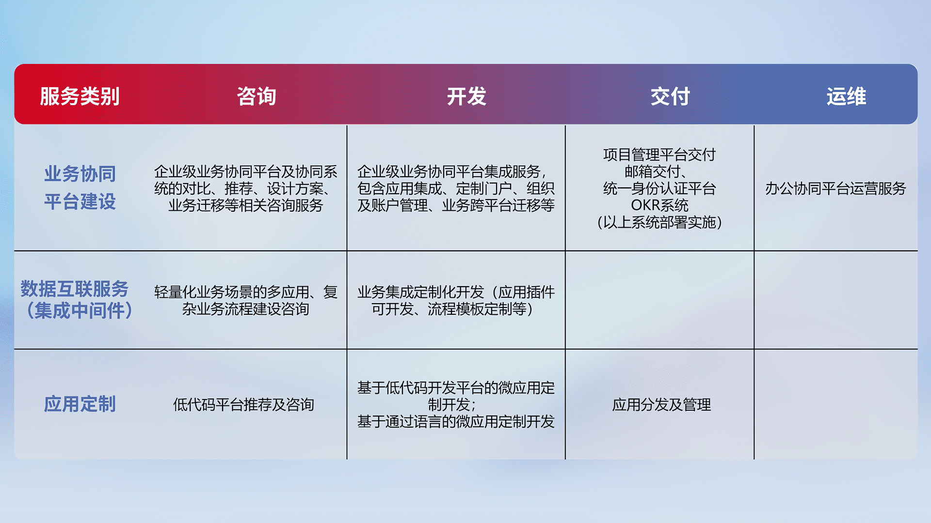 针对钉钉、、、企微、、、IDaas等平台级产品提供产品的规划、、、方案、、交付、、、定制化开发等服务,,实现如统一协同办公、、智能客户服务、、混合会议管理、、、智能数据查询、、、等业务场景,,,,实现数字化转型。。。。